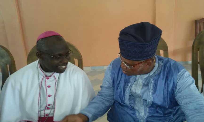 (Photo : L’évêque Mrg François Gnohoussou saluant l’He Edmond Agoua à la fin de la célébration de la messe)