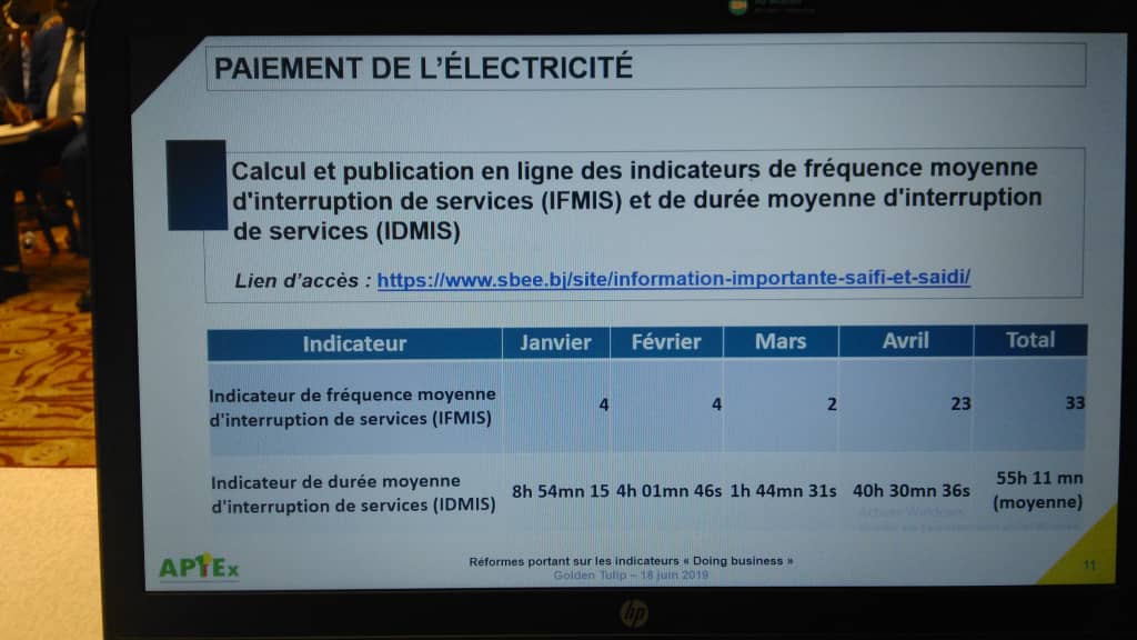 - la mise en place et la publication en ligne sur le site de la Société Béninoise d’Énergie Électrique (SBEE) de la fréquence moyenne des interruptions de service ;