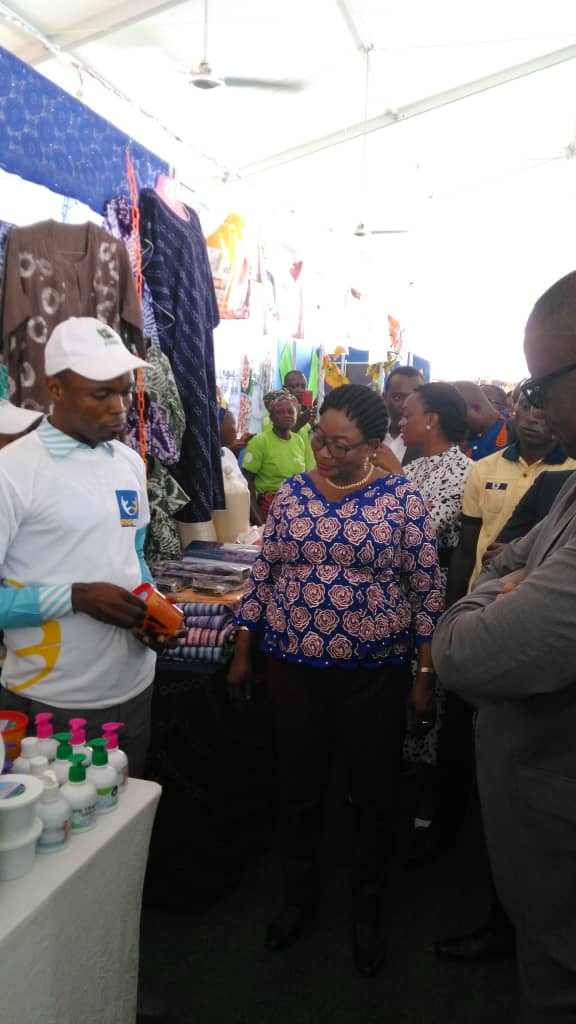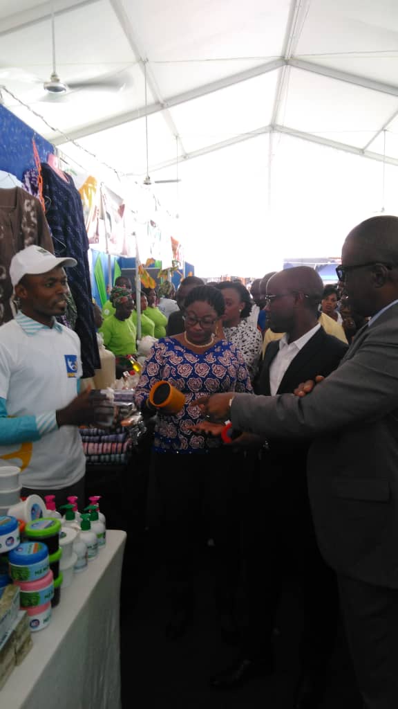 (Photo : Coupure du ruban d’ouverture de la 18ème Foire de l’indépendance du Bénin en présence des ministres Serge Ahissou, Modeste Tihounté Kérékou, Adam Bintou Taro, du Directeur général de l’APIEx et de la représentante du maire intérimaire de Cotonou, Ginette Aza-Gnandji)