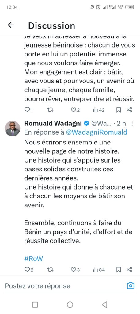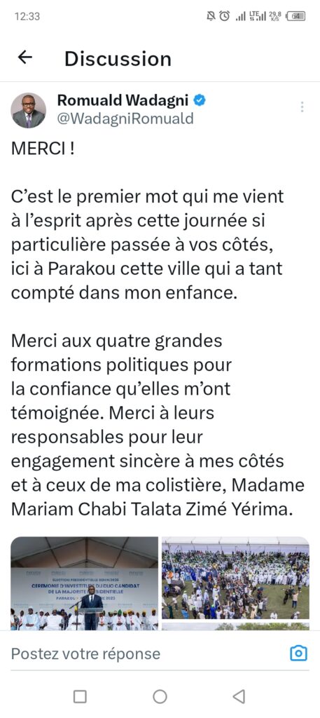 Sur sa page officielle de l’ex-Twitter, le plus jeune Président de la République dans l’histoire politique du Bénin depuis le renouveau démocratique en 1990, s’il arrivait à remporter la présidentielle en avril prochain, n’a pu trouver qu’un seul mot pour commencer son adresse. « MERCI ! », a écrit Romuald Wadagni. « C’est le premier mot qui me vient à l’esprit après cette journée si particulière passée à vos côtés, ici à Parakou cette ville qui a tant compté dans mon enfance. », a-t-il justifié avant de dresser le reste de son message dont voici ci-dessous l’intégralité.