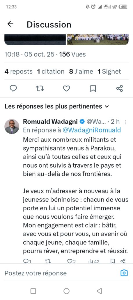Il est d’ores et déjà prêt. Prêt pour écouter le peuple, apporter des solutions à ses préoccupations et le servir en tant que détenteur du pouvoir qu’il est appelé par la majorité parlementaire et présidentielle a exercé dès avril 2026. Romuald Wadagni ne perd plus de temps au regard de sa réaction personnelle environ vingt-quatre heures après son investiture dans la cité des Kobourou, Parakou, au Nord du Bénin, pour la course à La Marina l’année prochaine. En effet, il y a quelques minutes, le candidat idéal pour succéder au chef de l’État sortant, Patrice Talon, s’est adressé à ses concitoyens dans un message plein de gratitude infinie diffusé sur le réseau social X, ce dimanche 5 octobre.