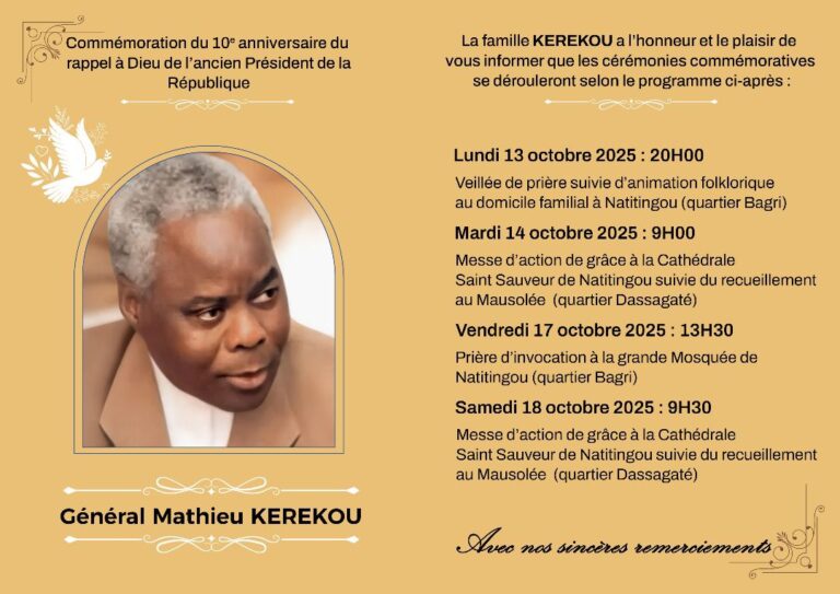 Dix ans après le départ de l’ancien Président de la République au royaume céleste, le souvenir national doit être marqué par un hommage proprement dit. C’est dans cet esprit que la famille du Général Mathieu Kérékou a arrêté un programme plein de cérémonies qui vont se dérouler précisément dans la ville natale du regretté. À Natitingou donc, ces cérémonies vont associer recueillement, prières et célébrations culturelles. Ainsi, du lundi 13 au samedi 18 octobre 2025, plusieurs moments forts sont prévus pour honorer la mémoire de l’ancien chef de l’État. La commémoration va débuter par une veillée de prière suivie d’une animation folklorique, lundi 13 octobre à 20h00, au domicile familial situé dans le quartier Bagri à Natitingou.