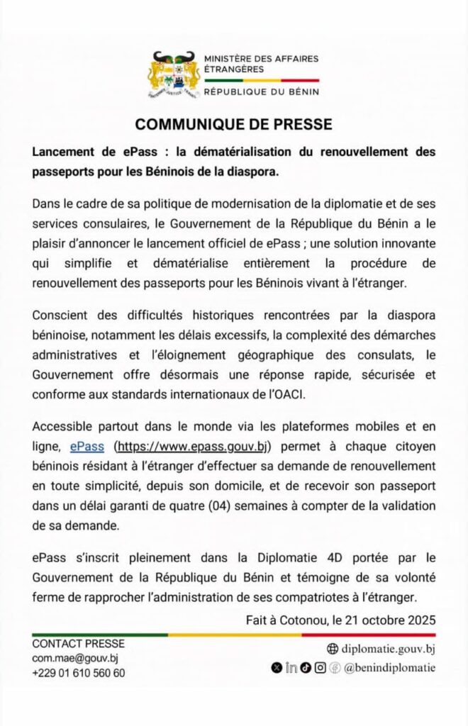 À en croire le communiqué de presse du gouvernement du président Patrice Talon, dont ci-dessous l’intégralité d’une copie parvenue à la rédaction differenceinfobenin.com et celle du journal quotidien « Différence Info » du Groupe de presse « DIFFÉRENCE », avec ePass, les béninois peuvent effectuer leur demande de passeport en ligne depuis chez eux (via https://www.epass.gouv.bj ou les plateformes mobiles). La particularité ou l’opportunité que présente cette initiative est la réception à domicile du nouveau passeport dans un délai garanti de quatre (04) semaines après validation. Il faut indiquer que la concrétisation de cette réforme numérique s’inscrit pleinement dans la Diplomatie4D de l’Exécutif béninois qui œuvre inlassablement pour un service rapide, sécurisé et conforme aux standards internationaux de l’OACI. La vision est claire : rapprocher l’administration de ses citoyens, où qu’ils soient dans le monde. Il ne reste qu’à profiter.