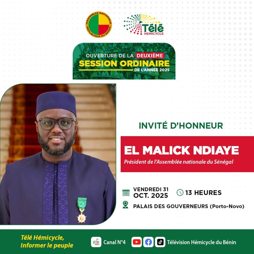 La deuxième session ordinaire de l’année 2025 de l’Assemblée nationale s’ouvre, ce jour, vendredi 31 octobre, à Porto-Novo. Cette plénière sera riche en présence de personnalités politiques sur le plan de la diplomatie parlementaire. En effet, le vent de la jeunesse au Pouvoir qui souffre dans les pays modèles de la démocratie, notamment du Sénégal et en direction du Bénin en avril 2026, a eu raison du président de l’Assemblée nationale sénégalaise qui est déjà sur le sol hospitalier béninois. Motif ? El Malick Ndiaye est l’invité d’honneur de l’ouverture de la Deuxième session ordinaire de l’année 2025 de l’Assemblée nationale.