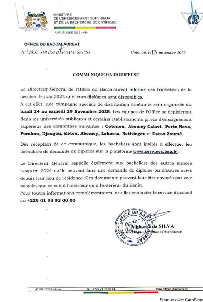 À travers un communiqué radiodiffusé N•1360/OB/DSI/DAF/SAFC/SAP/SA signé le 13 novembre 2025 par le Directeur de l’Office du Baccalauréat (DOB), dont une copie est parvenue à la rédaction differenceinfobenin.com et celle du journal quotidien « Différence Info.» du Groupe de presse « DIFFÉRENCE », ici à Porto-Novo, ce lundi 17 novembre, les bacheliers de la session de juillet 2022 sont concernés par une importante information. Le Prof Alphonse da Silva les informe que leur diplôme, c’est-à-dire le BAC, est disponible. « À cet effet, une campagne spéciale de distribution itinérante sera organisée du lundi 24 au samedi 29 novembre 2025. », renseigne le document administratif. Où et comment retirer le sésame ? Ci-dessous, la réponse détaillée de l’Office dans l’intégralité du communiqué radiodiffusé.