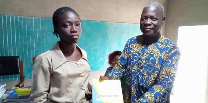 Photo : Dr Cyriaque Adekimbi Edon (blanc à D), remettant les manuels scolaires, au CEG 2 Savè, ce lundi 1er décembre
