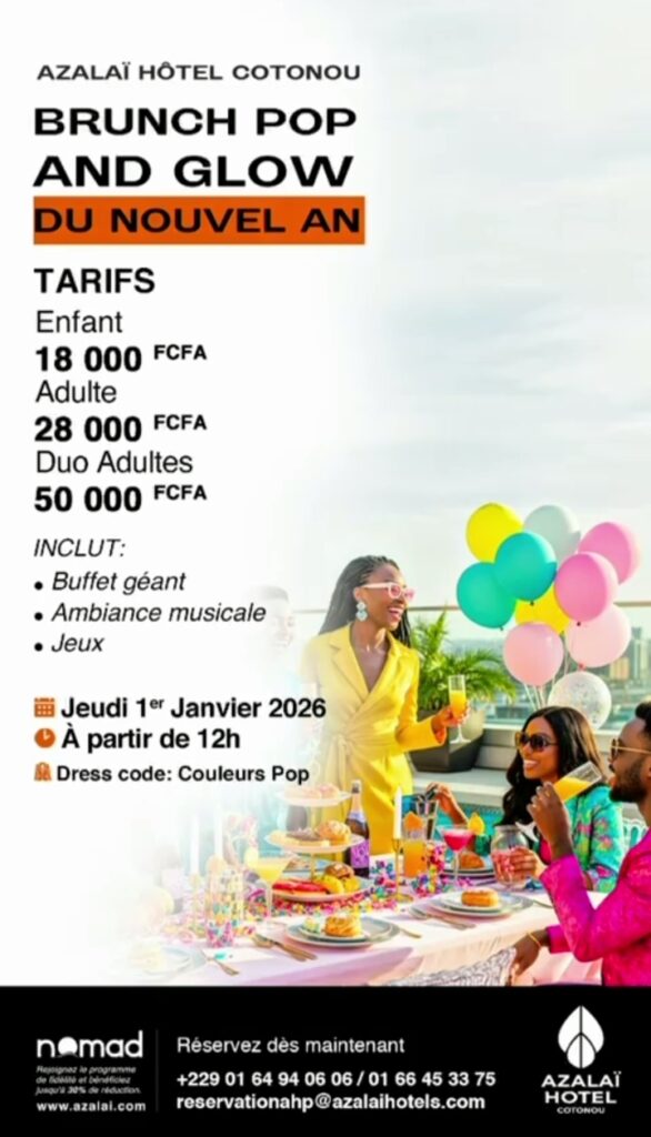 Enfin, pour accueillir la nouvelle année avec éclat, Azalaï Hôtel de Cotonou propose le Brunch Pop and Glow du Nouvel An 2026. Un concept moderne et festif, mêlant saveurs audacieuses, musique entraînante et touches lumineuses, pour démarrer l’année dans une ambiance résolument glamour et joyeuse.