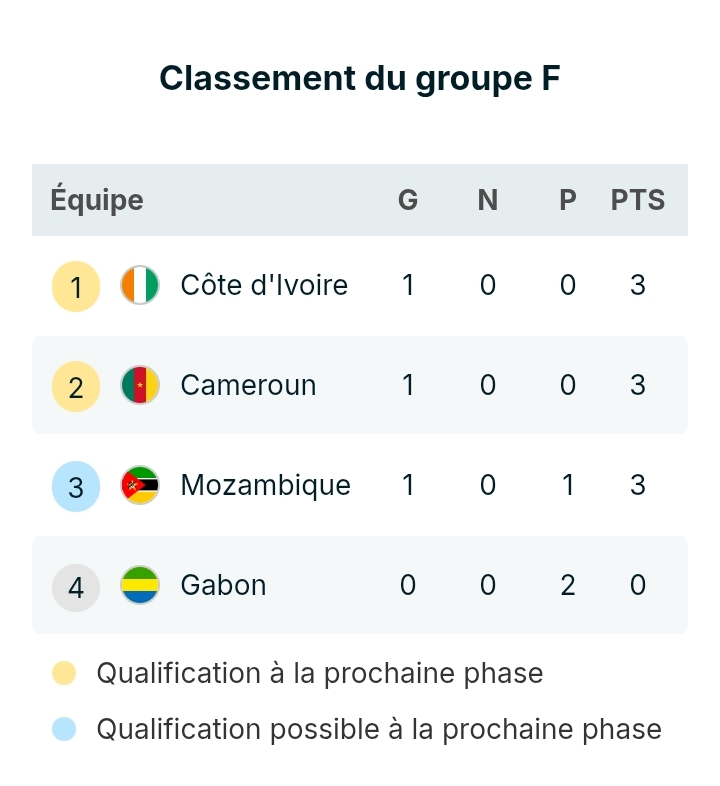 Avec trois points au compteur, les Mambas se placent idéalement dans la course à une qualification en huitièmes de finale, qui serait tout aussi historique. Ils affronteront le Cameroun lors de la troisième et dernière journée. Le constat est bien plus sombre pour le Gabon. Toujours sans le moindre point, les Panthères sont désormais quasi éliminées. Elles devront impérativement battre la Côte d’Ivoire, mercredi 31 décembre, et espérer un repêchage parmi les meilleurs troisièmes pour prolonger leur aventure. En attendant, le groupe F poursuit sa deuxième journée avec un choc très attendu entre la Côte d’Ivoire et le Cameroun, deux équipes qui comptent chacune trois points avant ce duel décisif.