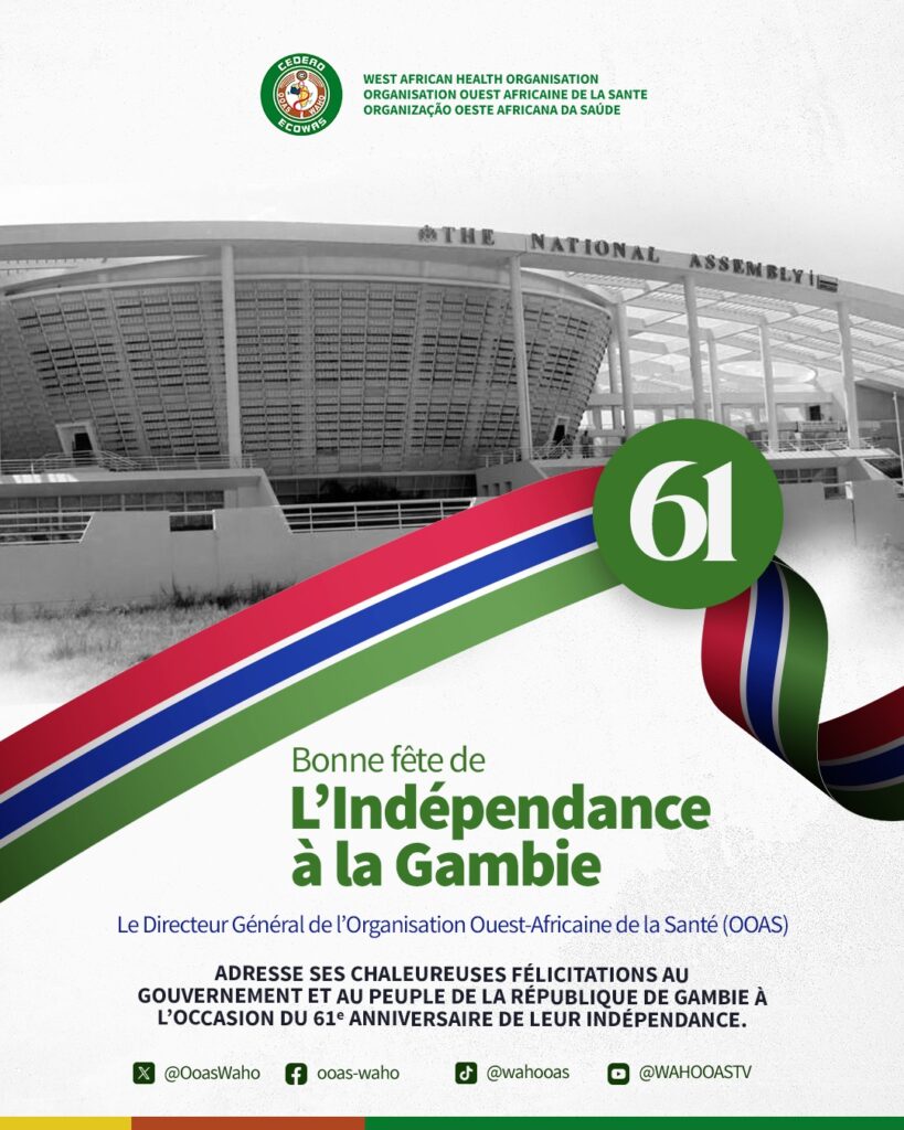 À l’occasion du 61e anniversaire de l’indépendance de la République de Gambie, l’Organisation Ouest Africaine de la Santé (OOAS) a adressé un message officiel de félicitations au Gouvernement et au peuple gambien. Le message, signé par son Directeur général, Dr Melchior Athanase Joël Codjovi Aïssi, a été publié ce mercredi 18 février. Une copie est parvenue à la rédaction differenceinfobenin.com et du quotidien « Différence Info » du Groupe de presse « DIFFÉRENCE », à Porto-Novo.