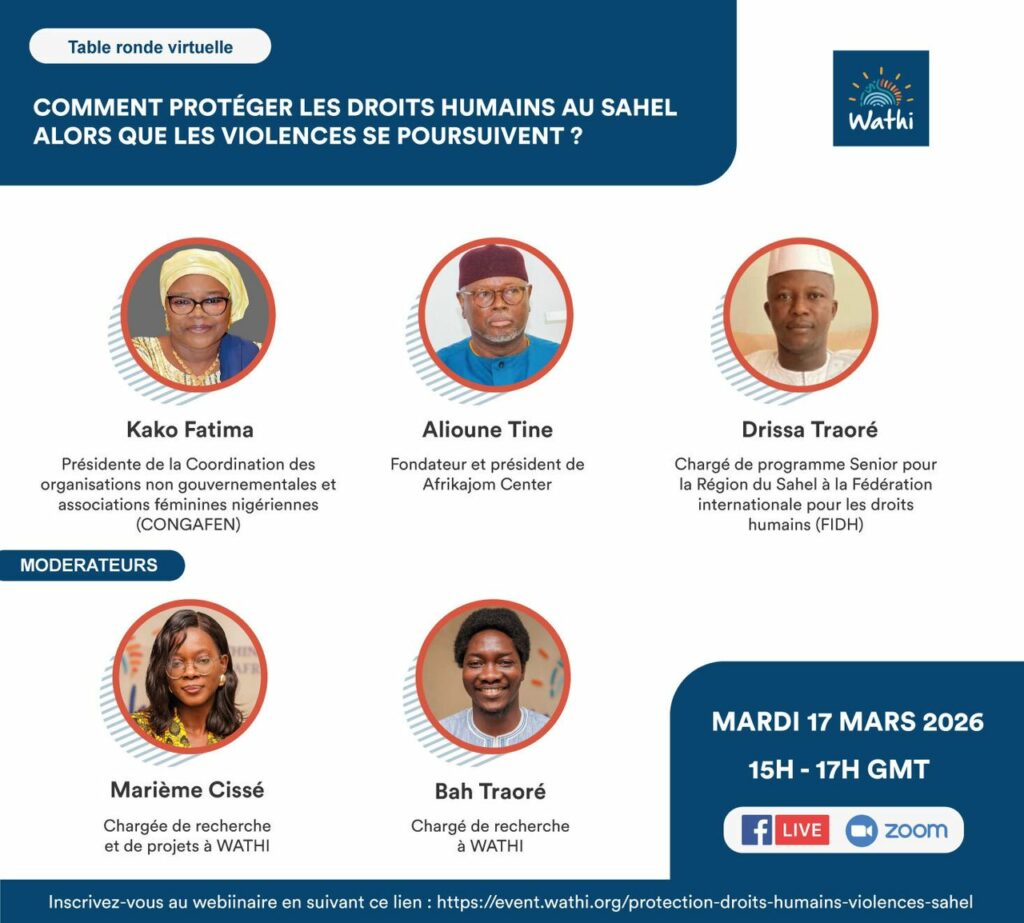Le think tank citoyen ouest-africain WATHI organise, ce mardi 17 mars, à 15h GMT, une table ronde virtuelle consacrée à la situation des droits humains dans la région sahélienne. Placée sous le thème « Comment protéger les droits humains au Sahel alors que les violences se poursuivent ? », cette rencontre en ligne ambitionne d’ouvrir un espace de réflexion et de dialogue autour des défis croissants auxquels sont confrontées les populations de cette région. Depuis plusieurs années, le Sahel est le théâtre d’une escalade de violences marquée par les attaques de groupes armés, les tensions communautaires et les opérations militaires menées par les États. Dans ce contexte sécuritaire fragile, les populations civiles demeurent particulièrement vulnérables, avec des violations récurrentes des droits humains, des déplacements massifs et un accès limité aux services essentiels.