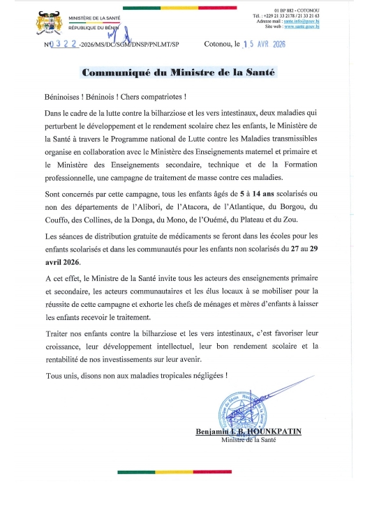 La distribution gratuite des médicaments, renseigne le communiqué parvenu à la rédaction differenceinfobenin.com et du quotidien « Différence Info » du Groupe de presse « DIFFÉRENCE », à Porto-Novo, se déroulera du 27 au 29 avril 2026. Les enfants scolarisés recevront leur traitement directement dans les établissements scolaires, tandis que ceux non-scolarisés seront pris en charge au niveau des communautés. Le ministre appelle à une mobilisation générale pour assurer le succès de cette initiative. Enseignants, acteurs communautaires, élus locaux, mais aussi parents, sont invités à s’impliquer activement afin de garantir une large couverture.