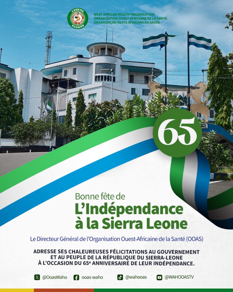 Ce lundi 27 avril est un jour spécial pour la Sierra Leone. C’est le jour d’une nouvelle bougie parfumée d’indépendance. À l’occasion du 65e anniversaire de l’indépendance du pays, l’Organisation Ouest Africaine de la Santé dirigée par le Dr Melchior Athanase Joël Codjovi Aïssi a adressé ses chaleureuses félicitations au gouvernement et au peuple sierra-léonais, saluant le parcours d’un pays marqué par une remarquable capacité de résilience.