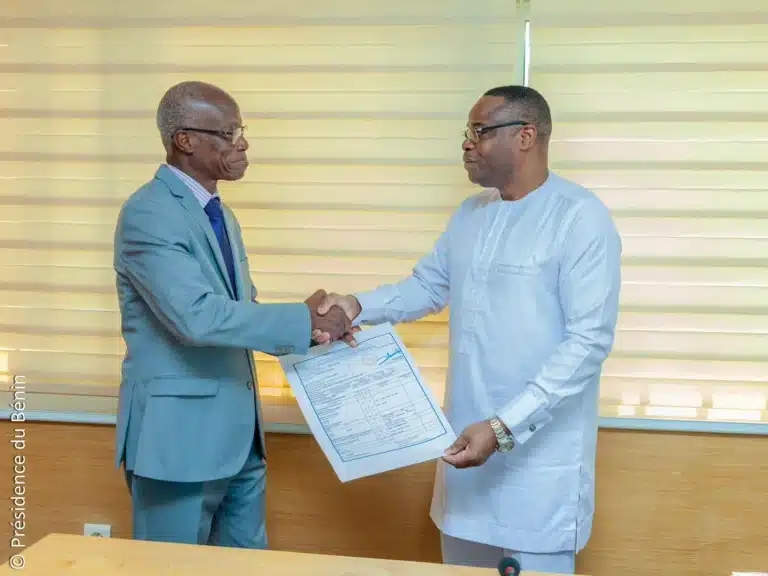 Photo : Le DG d’Amazone Airlines, Lambert Loko, recevant le permis d’exploitation des mains du DG ANAC, Karl Lègba, à Cotonou La compagnie aérienne Amazone…