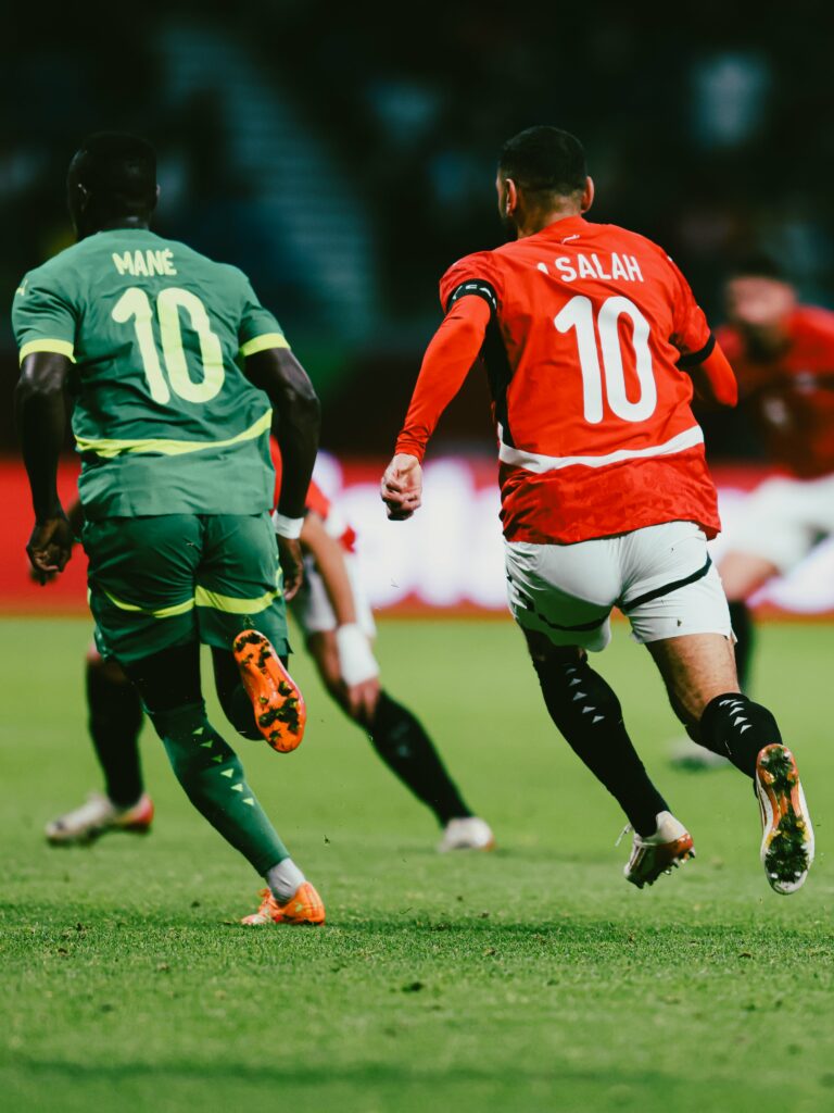 Photo : Les attaquants sénégalais Sadio Mané et égyptien Mohamed Salah, fixant la finale au Grand Stade de Tanger, ce mercredi 14 janvier Sous le…