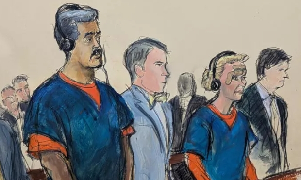 Photo : Le président vénézuélien déchu Nicolas Maduro et son épouse Cilia Flores devant le tribunal fédéral de Manhattan avec leurs avocats, dessin d’audience, ce…