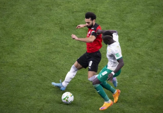 Photo : Les attaquants sénégalais Sadio Mané et égyptien Mohamed Salah, fixant la finale au Grand Stade de Tanger, ce mercredi 14 janvier Sous le…