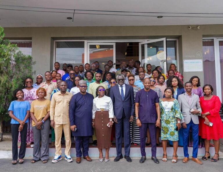 Photo : Le Représentant national de la CEDEAO au Bénin, Amadou Diongue, en famille avec les journalistes participants, à Cotonou, lundi 13 octobre La Communauté…