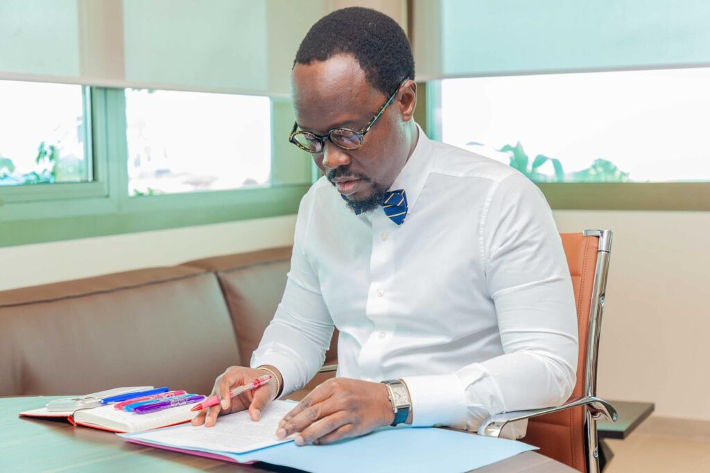 Photo : Le ministre des Petites et Moyennes Entreprises et de la Promotion de l’Emploi, Modeste Tihounté Kérékou Visiblement dans son nouveau bureau au sein…