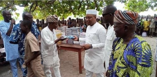 Photo : Dr Cyriaque Adekimbi Edon (blanc à D), remettant les manuels scolaires, au CEG 2 Savè, ce lundi 1er décembre Les écoliers du CEG…